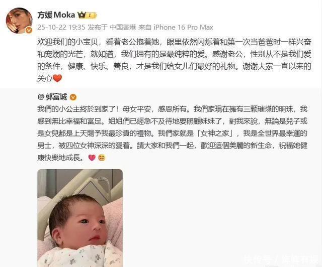 可惜的是,这一次郭富城又生了一个女儿,尽管他表示很开心,但还是有些失望。对于他来说,也许儿子更符合他的期望,也是他和方媛坚持生三胎的原因。 作为妈妈,方媛也发文了,她反而很高兴,看着郭富城抱着三女儿,她说性别从不是她们爱的条件。