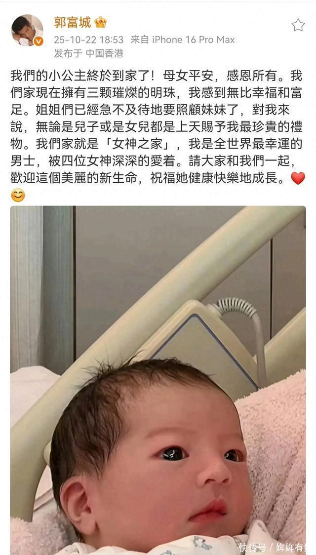 10月22日,郭富城发文称,他的第三个女儿出生了,他很开心的给网友分享了这个好消息。从他的发文内容来看,郭富城还是非常开心的,他也否认了只想生儿子的传闻,称不管是儿子还是女儿,都是上天赐给他最好的礼物。现在,家里有四个女神,他就是世界上最幸福的人。